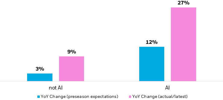 Companies that fell short of Q3 expectations tended to see sharper declines than normal, while those that reported strong earnings were less likely to see a pop in share price during the week of earnings compared to previous quarters.7 We feel this may suggest signs of investor AI fatigue. Concerns surrounding risks in private credit, a hawkish Fed pivot, and AI bubbles all emerged over the course of earnings season, likely spurring a bout of profit taking in select companies.