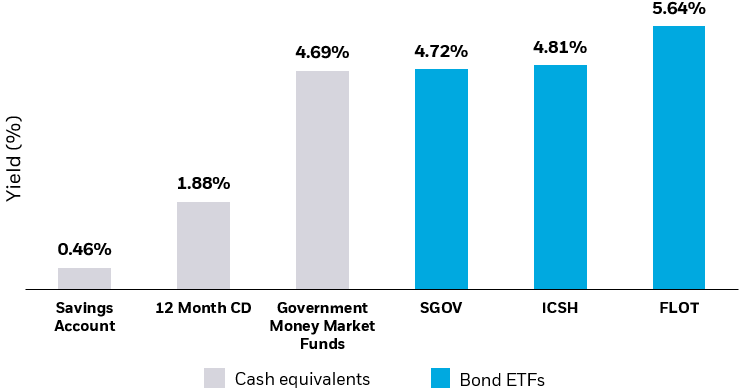 Source: BlackRock, FDIC, iMoneyNet, as of 10/31/2025. Govt Money Market Funds yield is the average 1-day simple net yield for government-only money market funds. Bond ETF yields are average yield to maturity. It’s important to note that there are material differences between Savings accounts, Money Market Funds, CDs and ETFs, including investment objectives, risks, fees, and expenses. CDs are fixed income investments that generally pay a set rate of interest over a fixed time period until maturity, whereupon the principal is typically returned plus any interest earned. Early withdrawal from CDs may result in interest penalties. Most savings accounts pay compound interest, meaning earnings are added to the balance to create a larger base on which future interest is paid. Most savings accounts allow you to add or withdraw money at any time without incurring a fee. Both Savings accounts and CDs principal investments are insured by the FDIC up to applicable FDIC limits, while ETFs are not FDIC insured and may lose value. Money Market funds typically seek to maintain a net asset value of $1.00 per share, but there is no guarantee they will do so and are not FDIC insured. Most ETFs seek to track an index, before fees and expenses. ETFs trade on exchanges intraday and may incur brokerage commissions. ETF shares can be sold at market price, which may be higher or lower than NAV, and are not individually redeemable from the fund. Diversification may not protect against market risk. Transactions in shares of ETFs may result in brokerage commissions and tax consequences. There can be no assurance that an active trading market for shares of an ETF will develop or be maintained. Short term bond ETFs may experience greater volatility than cash equivalents.