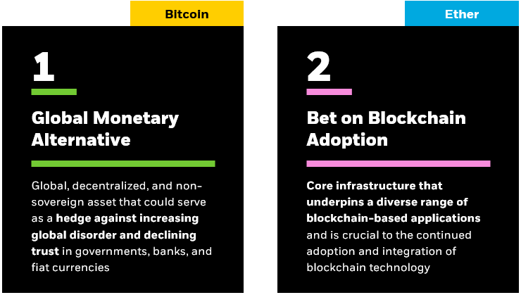 Chart description: Illustrative chart displaying the prominent investment themes behind Bitcoin and Ethereum.