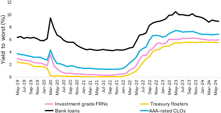 Chart description: Line chart displaying yield to worst over time between Treasury floating rate notes, investment grade floating rate notes, collateralized loan obligations, and bank loans.