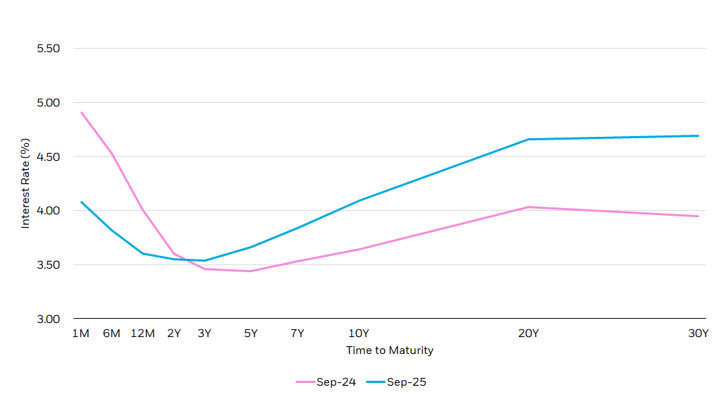 Source: Bloomberg using the Fed Funds target rate and 30-year US Treasury yields from September 18, 2024 to September 17, 2025.