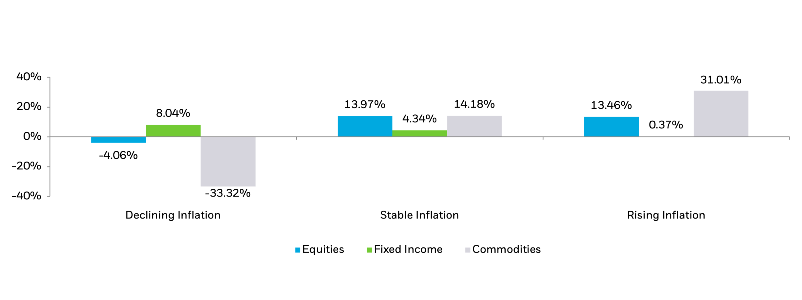 Source: BlackRock Calculation, Bloomberg as of 11/30/2023. Inflation periods defined by QoQ Seasonally-adjusted CPI changes of more or less than 18bps, or 40%, from the median QoQ CPI change of 44bps. Inflationary periods measured between Oct 2000 and Nov 2023. Equities are proxied by the S&P 500 Index, Fixed Income is proxied by the Bloomberg US Aggregate Bond Index, Commodities proxied by the S&P GSCI Total Return Index. For illustrative and educational purposes. Not a recommendation, offer or solicitation to buy or sell any securities or to adopt any investment strategy. Index performance is for illustrative purposes only. Index performance does not reflect any management fees, transaction costs or expenses. Indexes are unmanaged and one cannot invest directly in an index. Past performance does not guarantee future results.